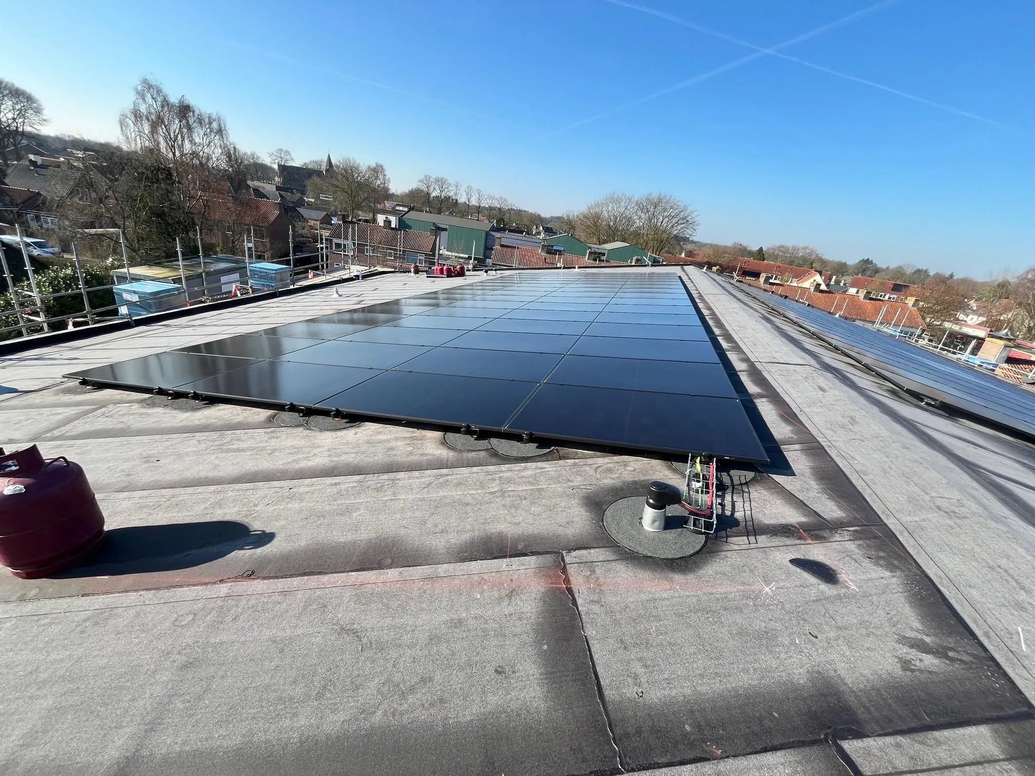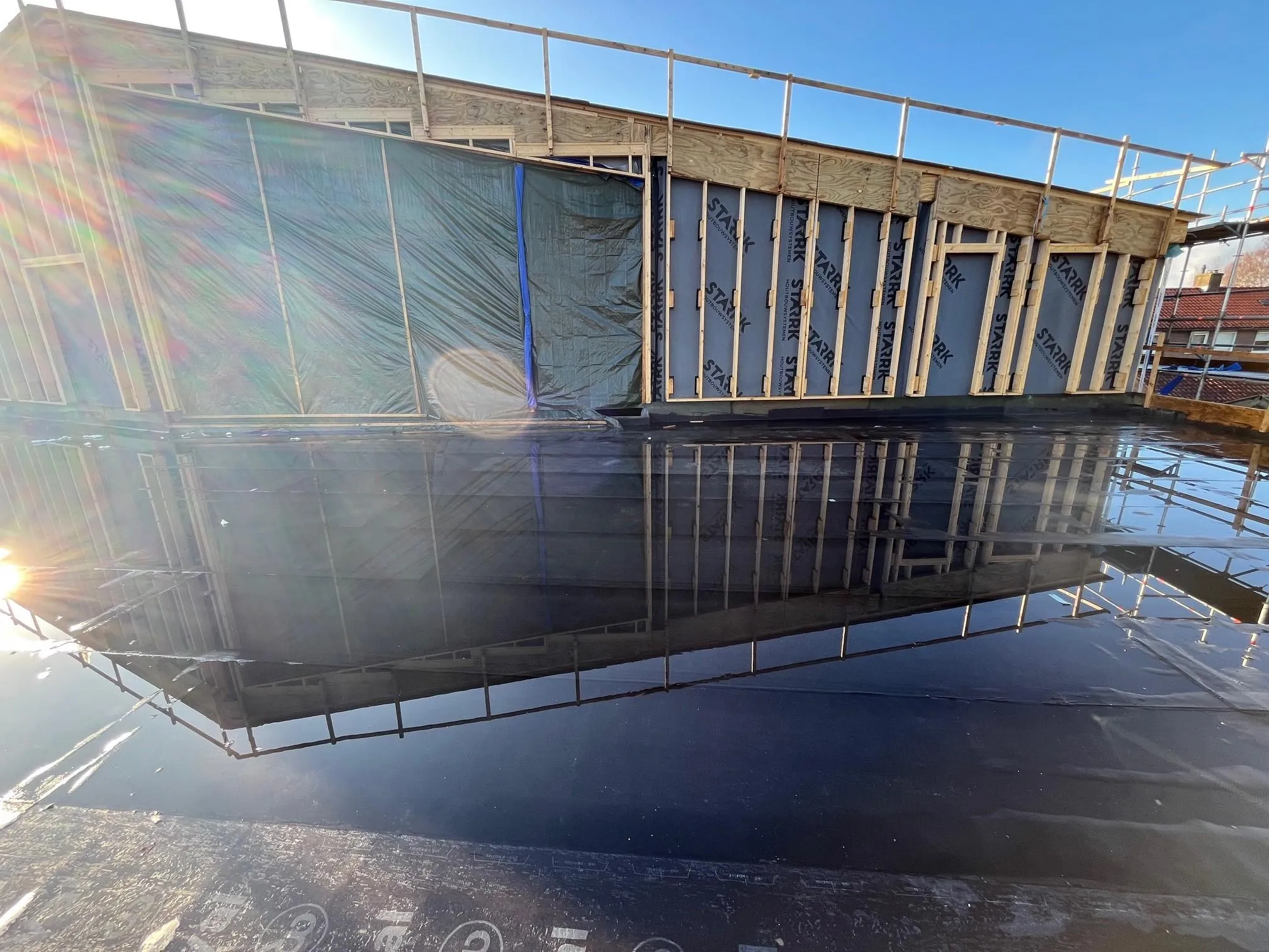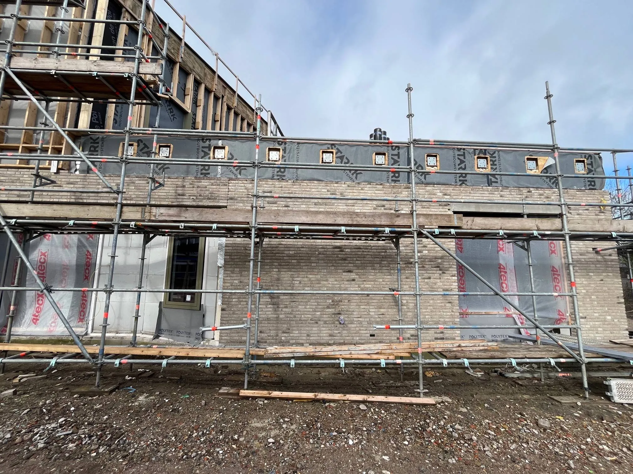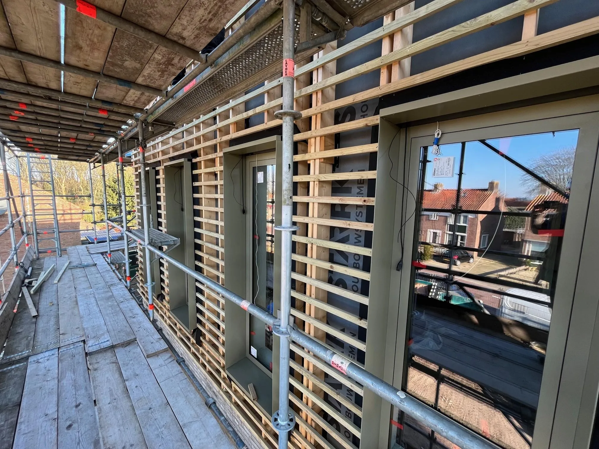 Ook buiten is veel werk verzet. Het gevelmetselwerk is volledig afgerond en de meeste buitenkozijnen zijn gemonteerd én voorzien van glas. De gevel van de eerste verdieping is al uitgetimmerd voor de gevelpannen, en daar is ook direct een start mee gemaakt. Intussen zijn alle daken geïsoleerd en voorzien van dakbedekking. Op het hoge dak zijn bovendien de valbeveiliging en de PV-panelen geplaatst, waardoor het geheel weer een mooie stap dichter bij de oplevering is gekomen.