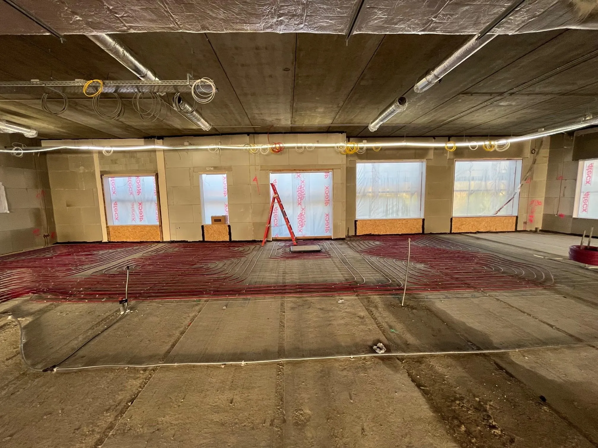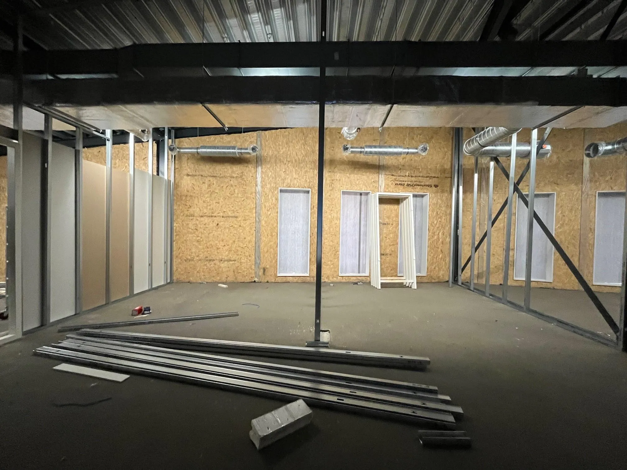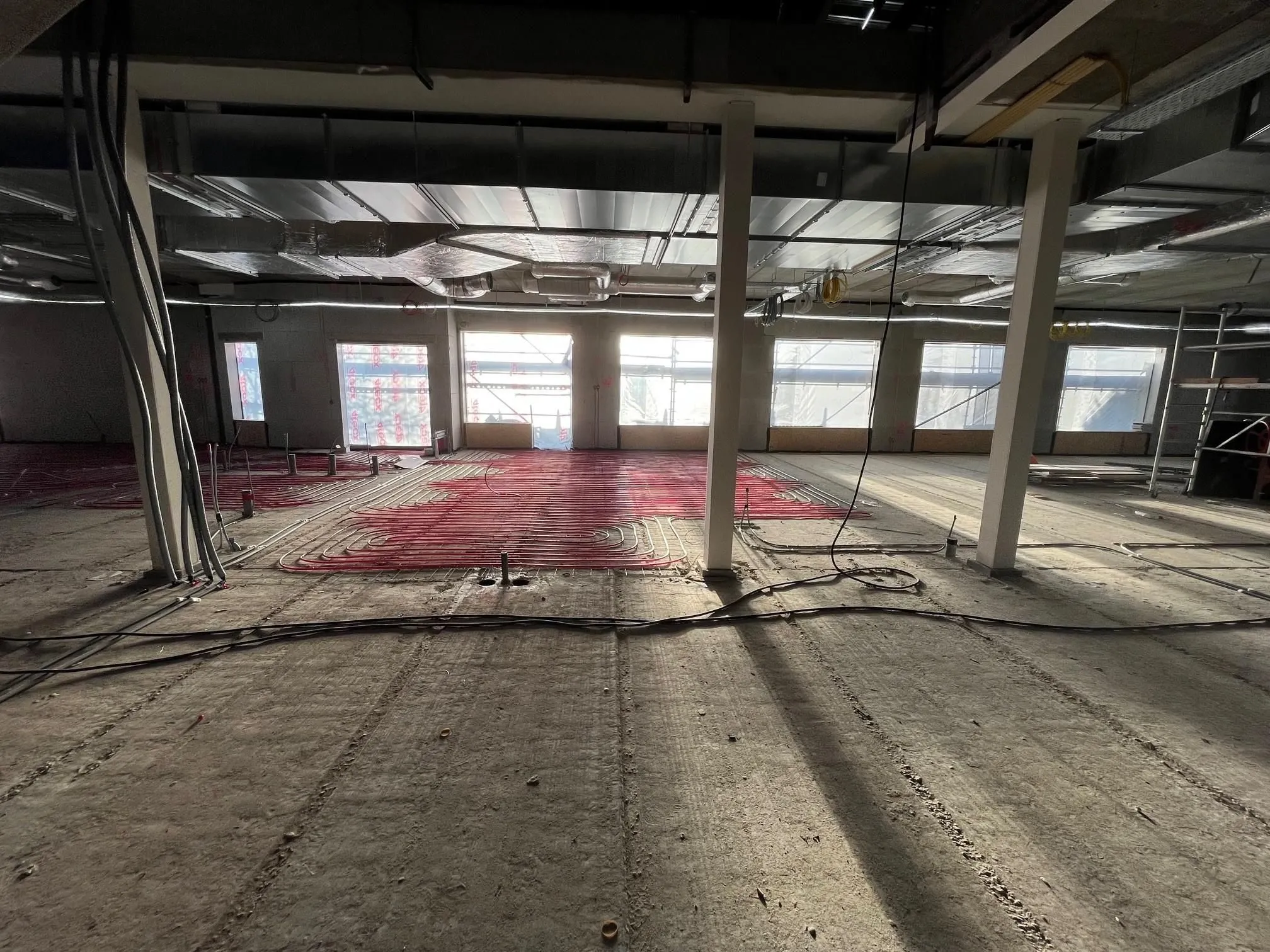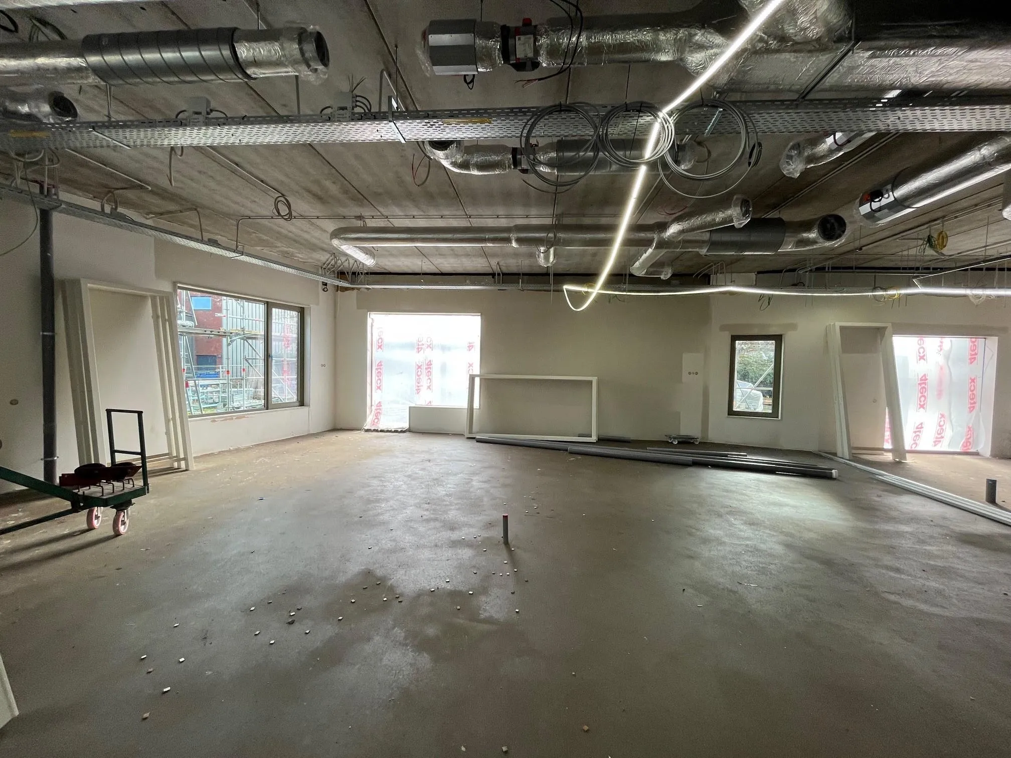 Het is alweer drie maanden geleden dat we de laatste bouwupdate deelden en in die tijd is er flink wat vooruitgang geboekt op de bouwplaats. Binnen is inmiddels goed te zien hoe het nieuwe schoolgebouw vorm krijgt. De installateur heeft alle luchtkanalen opgehangen en de vloerverwarming ligt erin. De elektricien is druk bezig met het aanbrengen van de elektrische installaties. Ook zijn de dekvloeren aangebracht. De wandenbouwer heeft de metalstudwanden geplaatst en kan nu beginnen met het sluiten ervan. Alle binnenkozijnen staan ondertussen al op hun plek, waardoor de ruimtes steeds beter herkenbaar worden.